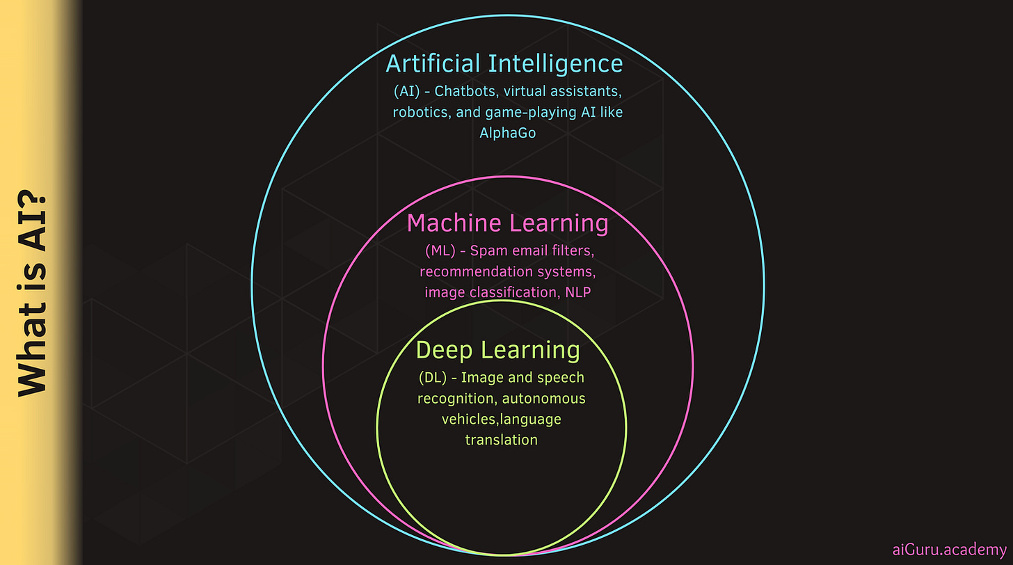 I am sure all of you know what AI is but to set the stage, here is the picture outlining AI, Machine Learning(ML), and Deep Learning(DL).