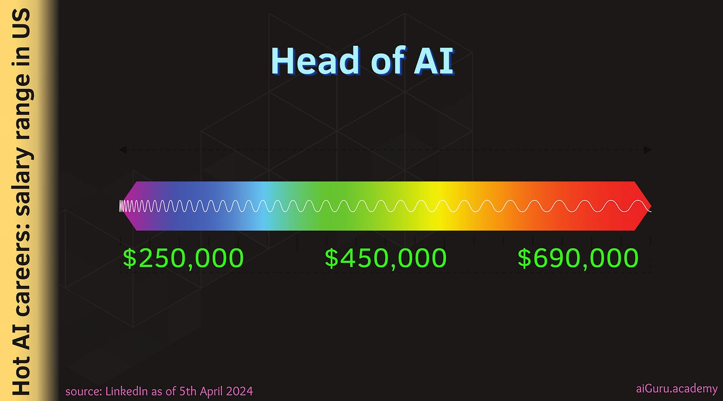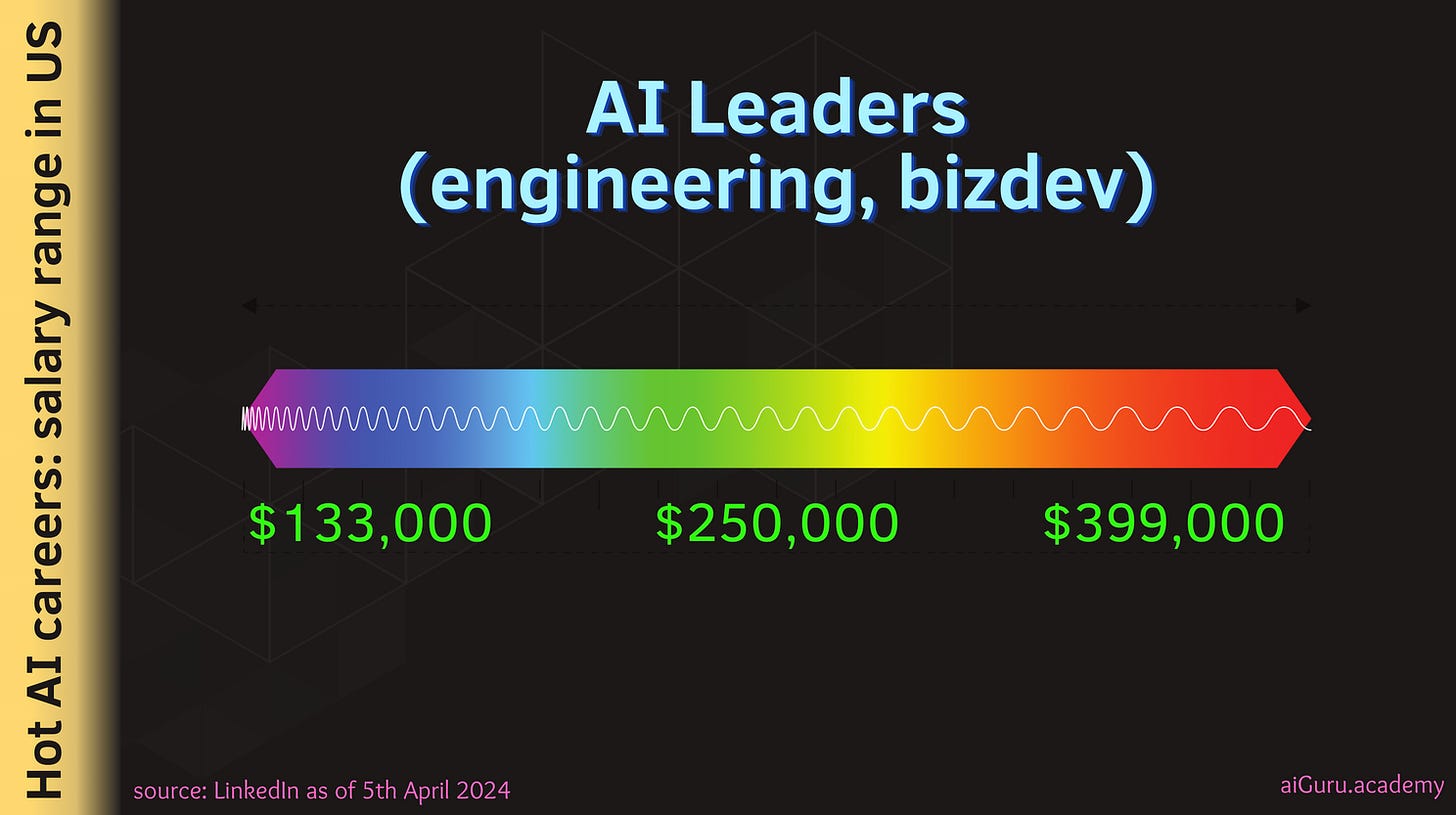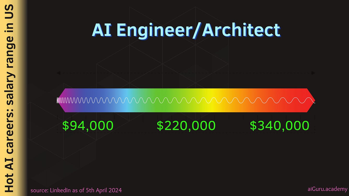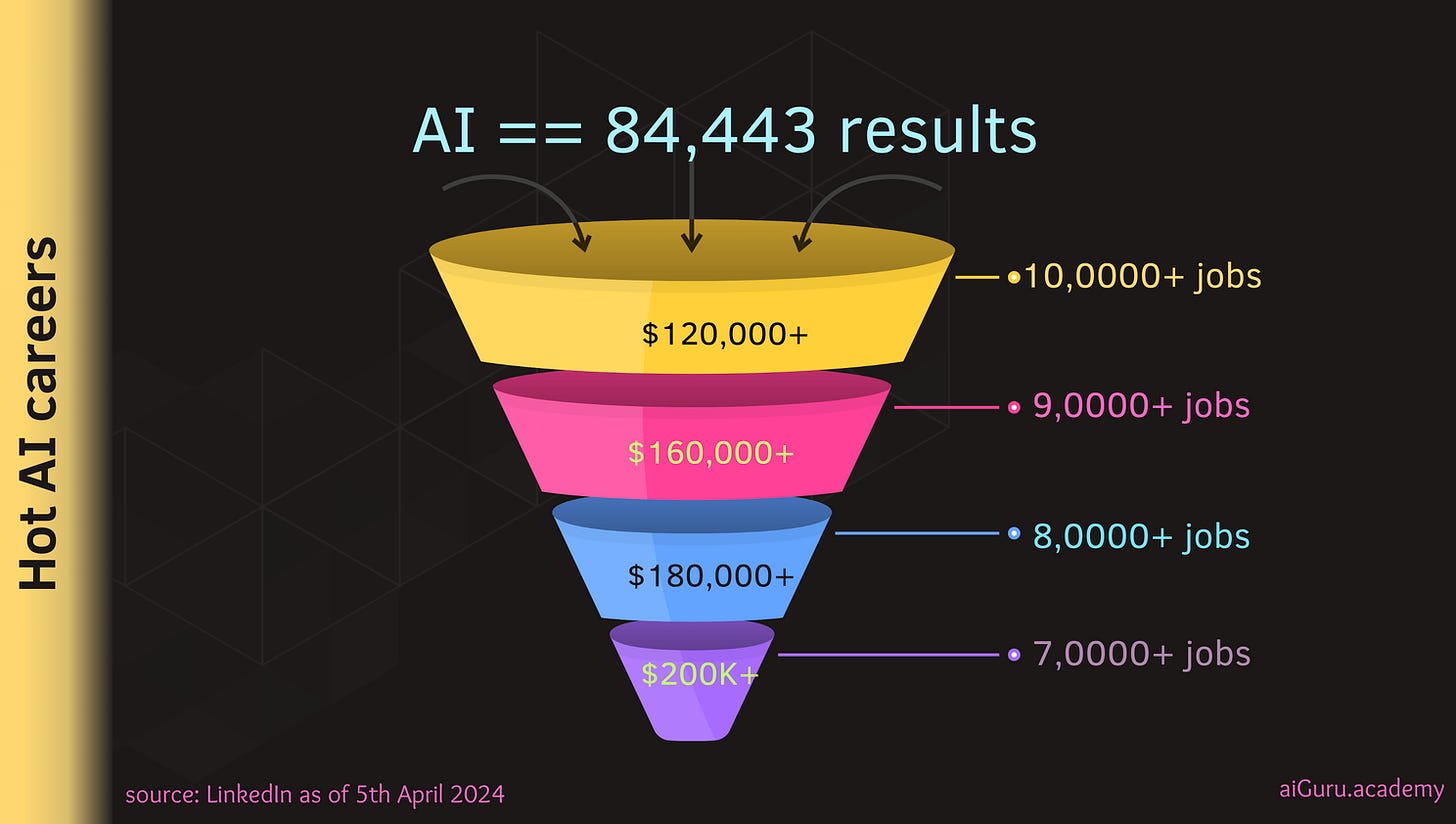 As of 5th April, 2024, there are 84,443 results for AI jobs - in the US. As you can see below the spread of the jobs paying anywhere starting $120K/year to $200K/year and beyond.