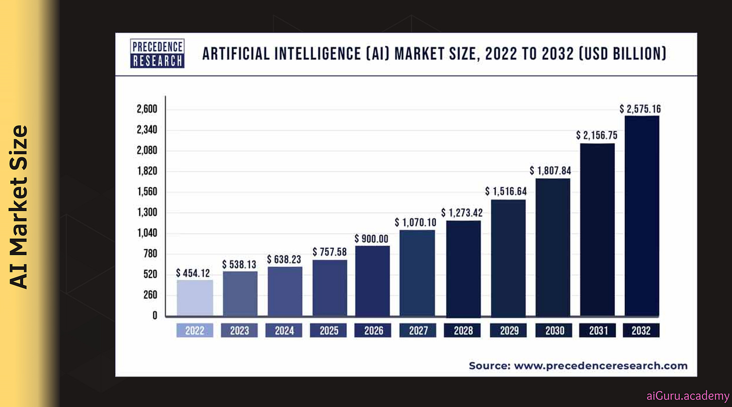 Above chart from precedence research shows that the global AI market size is growing year-over-year. The global AI market size was valued at USD 454.12 billion in 2022 and is expected to hit around USD 2,575.16 billion by 2032, progressing with a compound annual growth rate (CAGR) of 19% from 2023 to 2032. I still think these are conservative estimates when we are looking at next 8-10 years but even if we grow at 19% CAGR, I am happy.