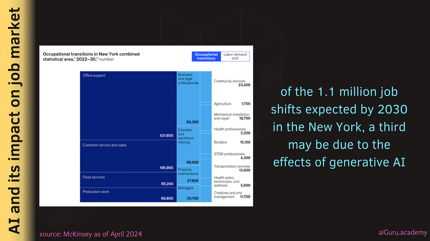 While there is a study done by our friends at McKinsey about generative AI and future of work in July, 2023, it's considered dated in the world of AI, isn't it? AI is moving way faster (and slower at the same time) than many of us had anticipated. So how about something more recent - a similar study McKinsey published (April 2024) about jobs impact with generative AI in New York. While New York being financial capital of the world, if New York is getting impacted, similar or maybe more impact be seen by rest of the world. The study publishes that the one third of the jobs in New York are expected to shift - means what people (including me and some of you who are in NY area) are doing today may not be the exact work they would do in 2030. Thanks to Generative AI :)
