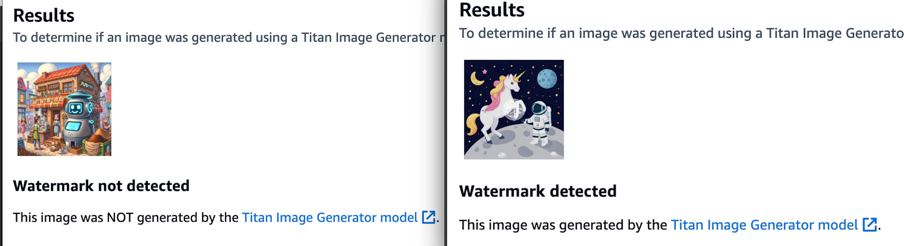 In the side-by-side image above, the left image was created by DALL·E, while the right image was generated by Amazon Titan Image Generator. As we can see, the watermark detection technique applied by Amazon Titan was able to detect the image created by their own model but not by the DALL·E model.